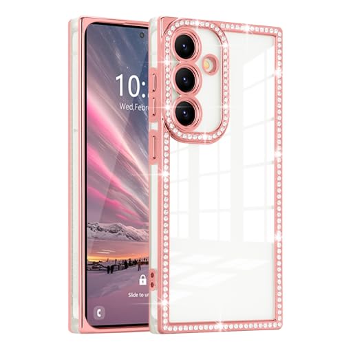 ROSEHUI Glitter Case for Samsung Galaxy S25 Plus,Clear Rectangle Electroplated Sparkle Bumper with Bling Rhinestones Phone Case for Women,Sparkly Diamond Camera Protection Soft TPU Cover-Rose gold