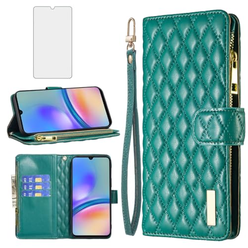 Asuwish Phone Case for Samsung Galaxy A05 Wallet Cover with Tempered Glass Screen Protector and Leather Flip Credit Card Holder Stand Cell Accessories Protective Heavy Duty Ao5 A 05 Women Girls Green