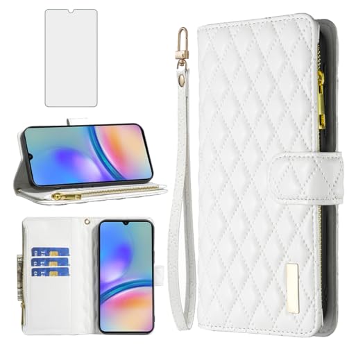 Asuwish Phone Case for Samsung Galaxy A05 Wallet Cover with Tempered Glass Screen Protector and Leather Flip Credit Card Holder Stand Cell Accessories Protective Heavy Duty Ao5 A 05 Women Girls White