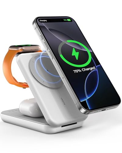 RORRY 3 in 1 Wireless Charging Station, 10000mAh Portable Powerbank for Magsafe iPhone 16/15/14/13/12, Magnetic Foldable Charger Stand for Apple Watch AirPods, PD 20W USB-C Power Bank for Samsung