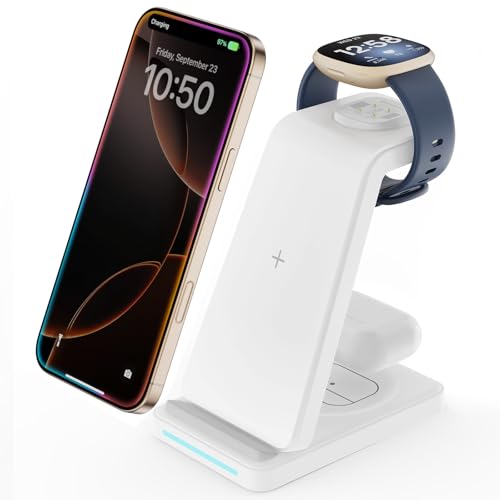 Wireless Charger for Fitbit Charging Station - GEEKERA 3 in 1 Phone Charger Stand for Google Pixel Watch 3/2/Fitbit Sense 2/Sense/Versa 4/3, iPhones/Samsung/Google Phones, AirPods 4/Pro/3/2-White