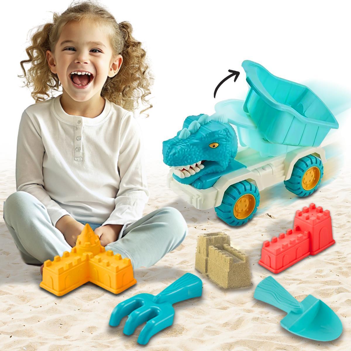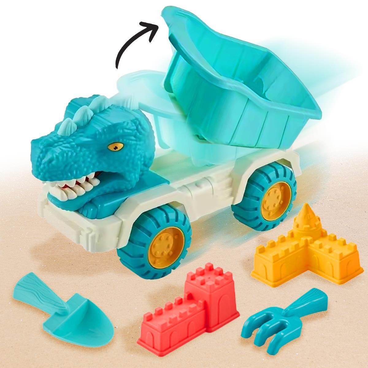 Kids 5PCs Dinosaur Beach Sand Dump Truck Toy With Shovel Rake & Moulds Play Set