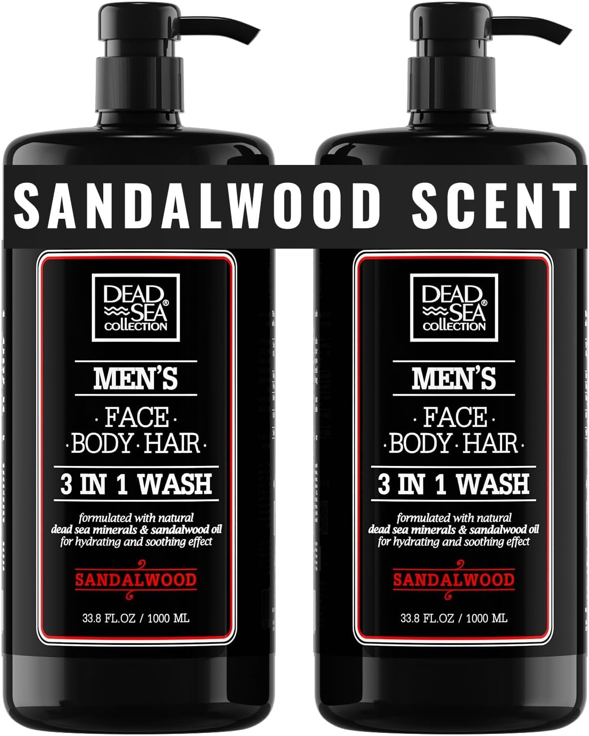 Dead Sea Collection Mens Shower Gel 3 in 1 with Sandalwood Oil and Dead Sea Salt - Body Wash, Shampoo for Men, Face Wash - Pack of 2 (1000 ml. each)