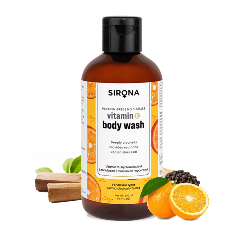 Sirona Natural Vitamin C Body Wash for Men & Women - 200 ml | Gel Based Shower Gel with Hyaluronic Acid, Sandalwood & Tasmanian Pepper Fruit | for