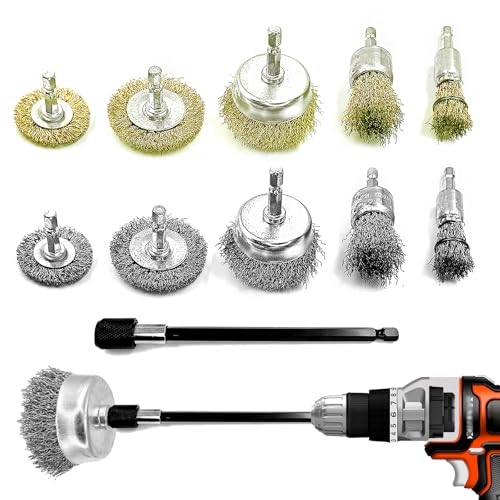 Daily Treasures 10 Pack Wire Wheel Cup Brush Set for Drill Abrasive with 1/4" Hex Shank, Extension Rod for Safty, Brass Coated Crimped Drill Sanding Attachment, Metal Brush for Drill Rust Removal