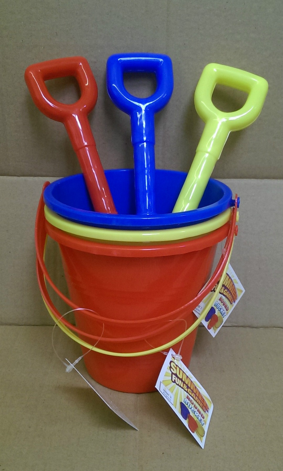 Set Of 3 Primary Coloured Spades & Round Buckets Ideal Sandpit/Beach Toys
