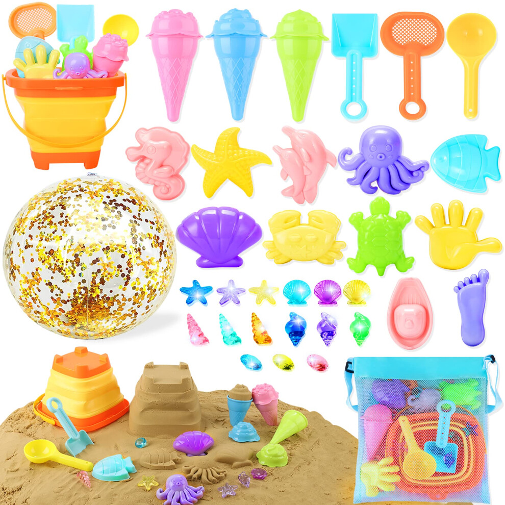 Beach Toys For Kids 31 Pcs, Bucket And Spade Beach Set Kids, Sand Toys With Beach Bucket, 16’’ Beach Ball, Ice Cream Toys For Kids, Gems, Sandpit Toys Outdoor Toys Toddlers Children