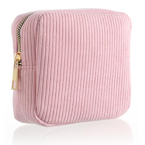 Bremorou Menstrual Bags for Teen Girls, Corduroy Sanitary Napkin Storage Bag Mini Makeup Pouch Portable Period Pouch with Zipper Sanitary Pads Bag Tampons Holder for Purse First Period Women (Pink)