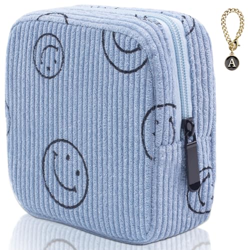 Teircno Sanitary Napkin Storage Bag,Preppy Corduroy Period Bag for Women, Cute Smiley Face,Portable Period Pouch with Zipper, Sanitary Pads Bag Tampons Holder for Purse, First Period