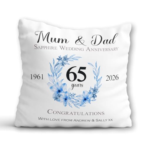 65th Wedding Anniversary Gift - Personalised 65th Anniversary Cushion - Blue Sapphire Wedding Anniversary Present for Parents Grandparents - 65 Years Marriage Anniversary Pillow with Custom Names