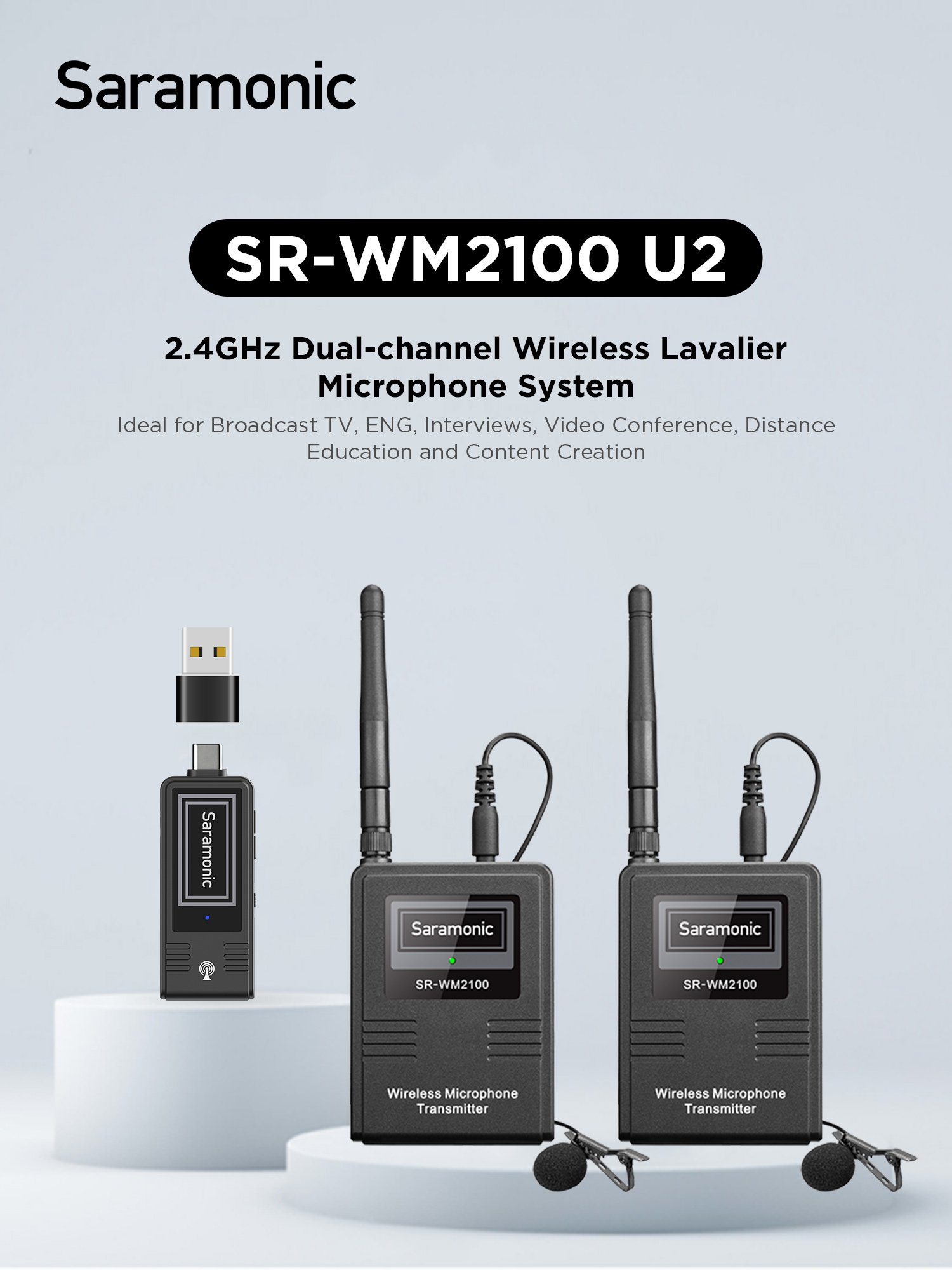Saramonic SR-WM2100X U1 U2 2.4GHz dual Wireless Lavalier Microphone System with USB-C USB-A connector for broadcast meeting TVs
