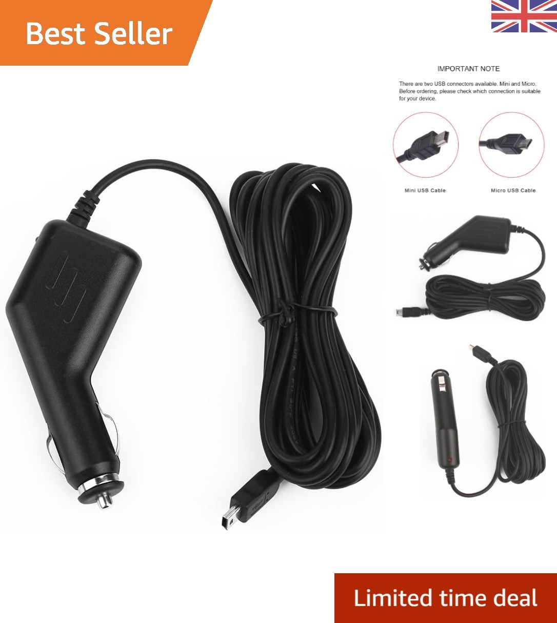 Universal Car Charger with 3.5M Mini USB Cable - Ideal for Dash Cams & Sat Navs