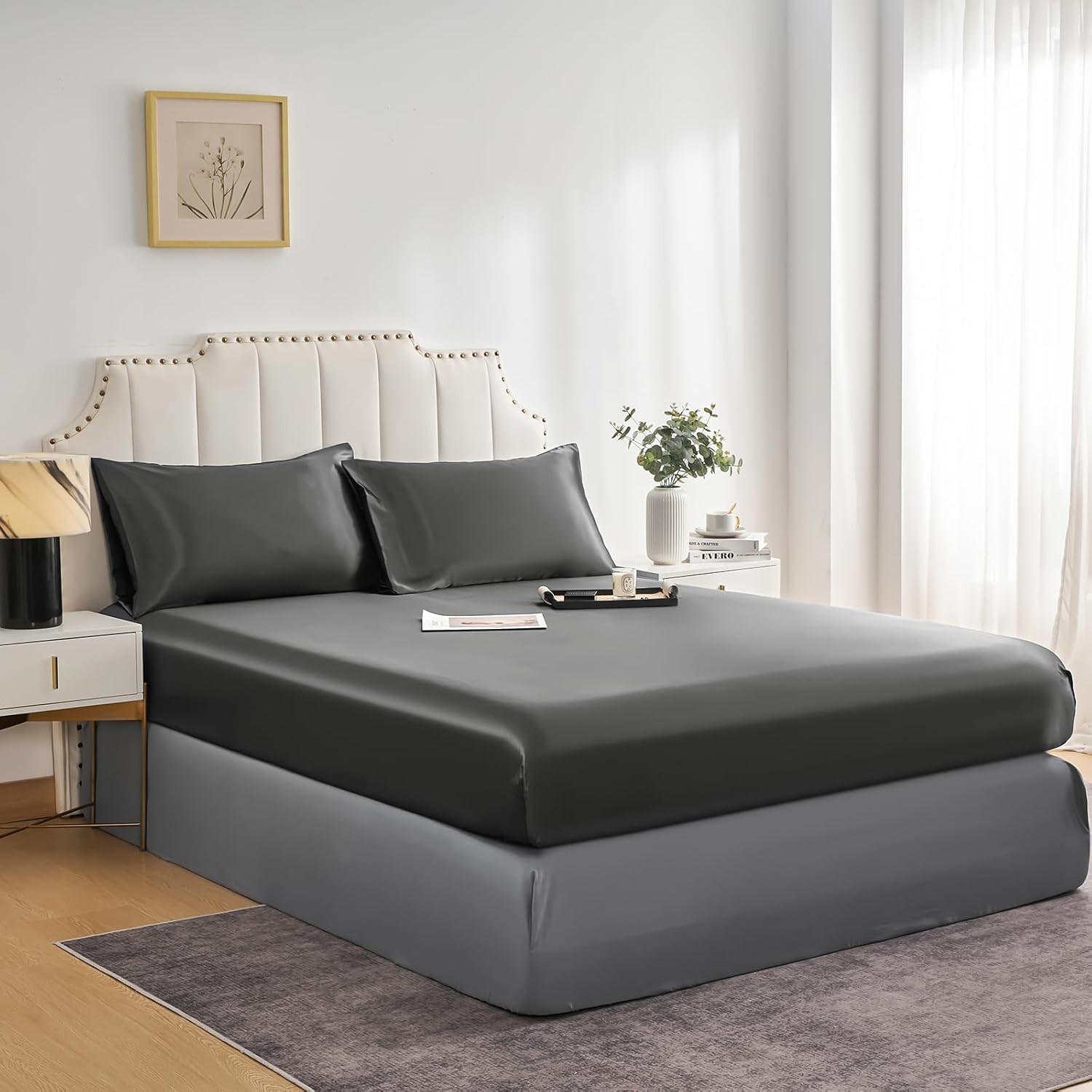 Satin Fitted Sheet Bed Sheets Dark Grey Double,Deep Pocket Satin Sheets Soft an