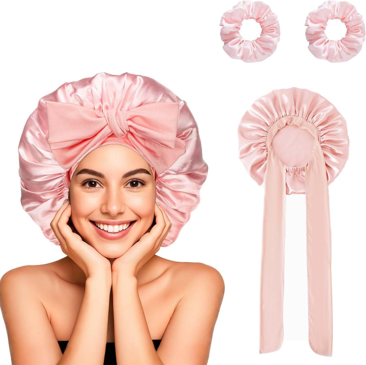 Flomiara Silk Bonnet for Sleeping Curly Hair, Adjustable Sleep Caps Skin Care, Cleaning, Makeup for Women Girl, Soft Easy to Use Satin Bonnets, Hair Bonnet with Tie Band for Most Hair Types Pink