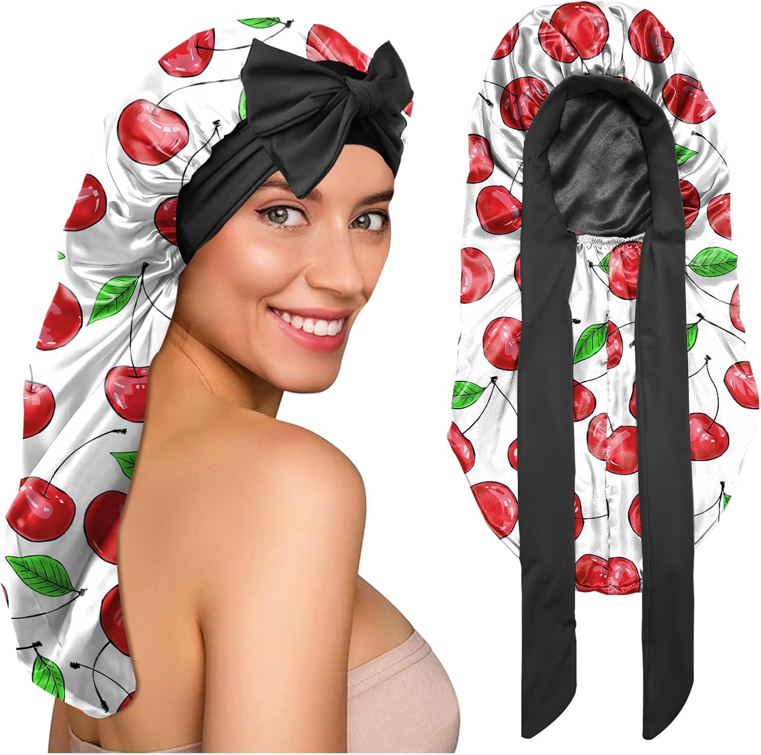 Euqvunn 2Pcs Hair Bonnet for Sleeping, Satin Hair Bonnet with 6.2×63cm Widen Tie Band, Sleep Bonnet, Bonnets for Women Suitable for Night Sleep, Long/Straight/Curly Hair Protection (Black Red)