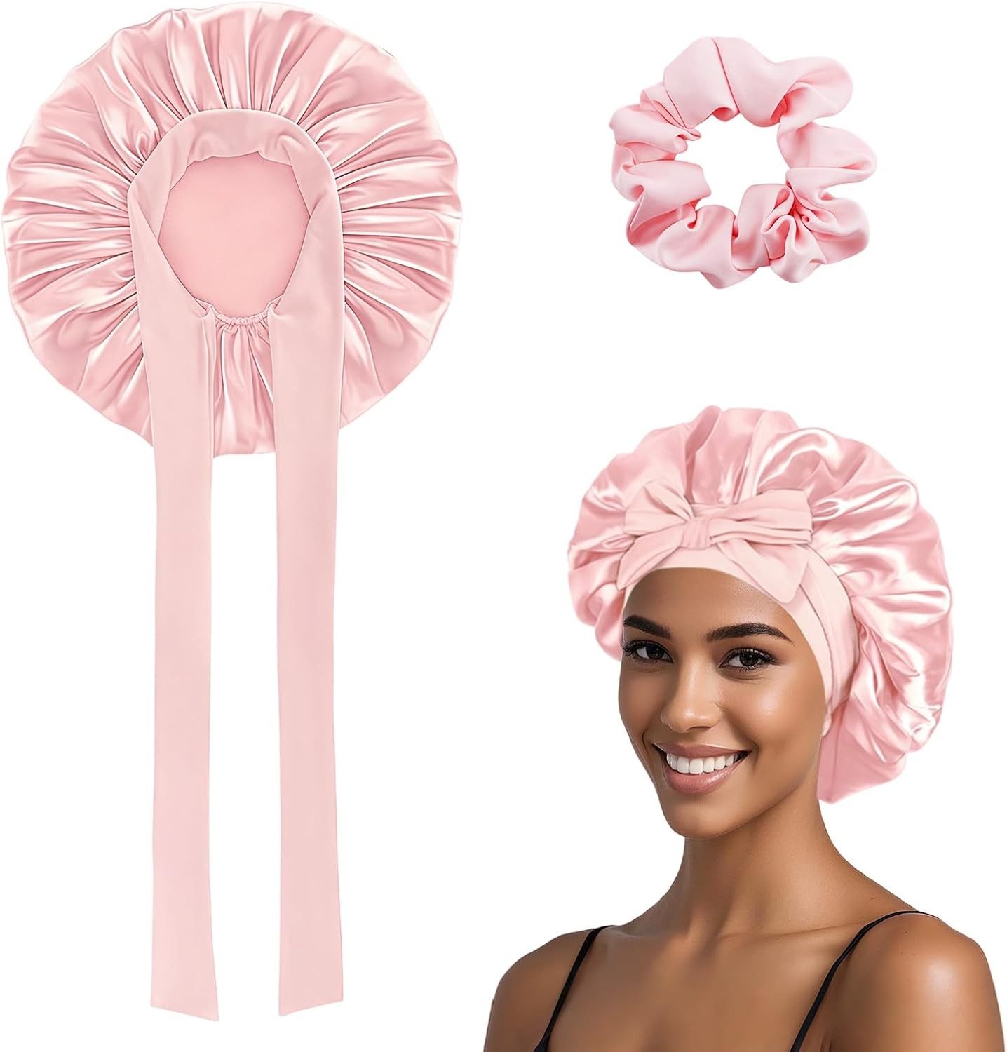 BONNET QUEEN Satin Hair Bonnet for Sleeping Silk Head Cover with Tie Band Hair Wrap Silk Sleep Cap for Curly Long Braid Tresse, Pink