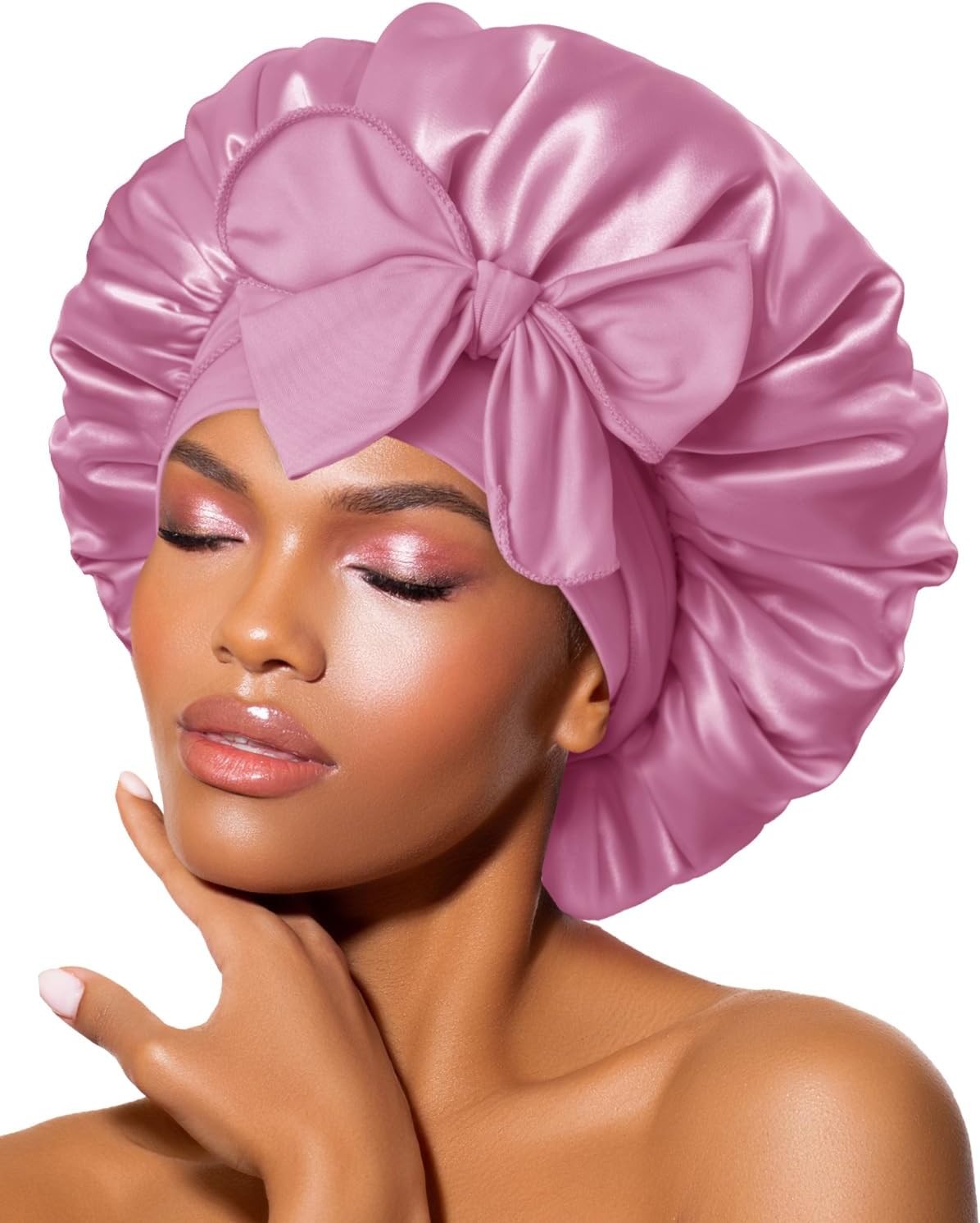 BONNET QUEEN Silk Bonnet for Sleeping Women Satin Bonnet Hair Bonnet Large Bonnet night sleep cap scarf wrap for curly hair with tie band Pink
