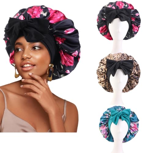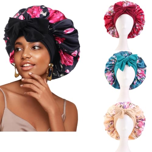 MOXYOY 3PCS Silk Bonnet, Satin Bonnet Hair for Sleeping, Silk Sleep Cap for Curly Women, Soft and Comfortable (Red, Black, Champagne)