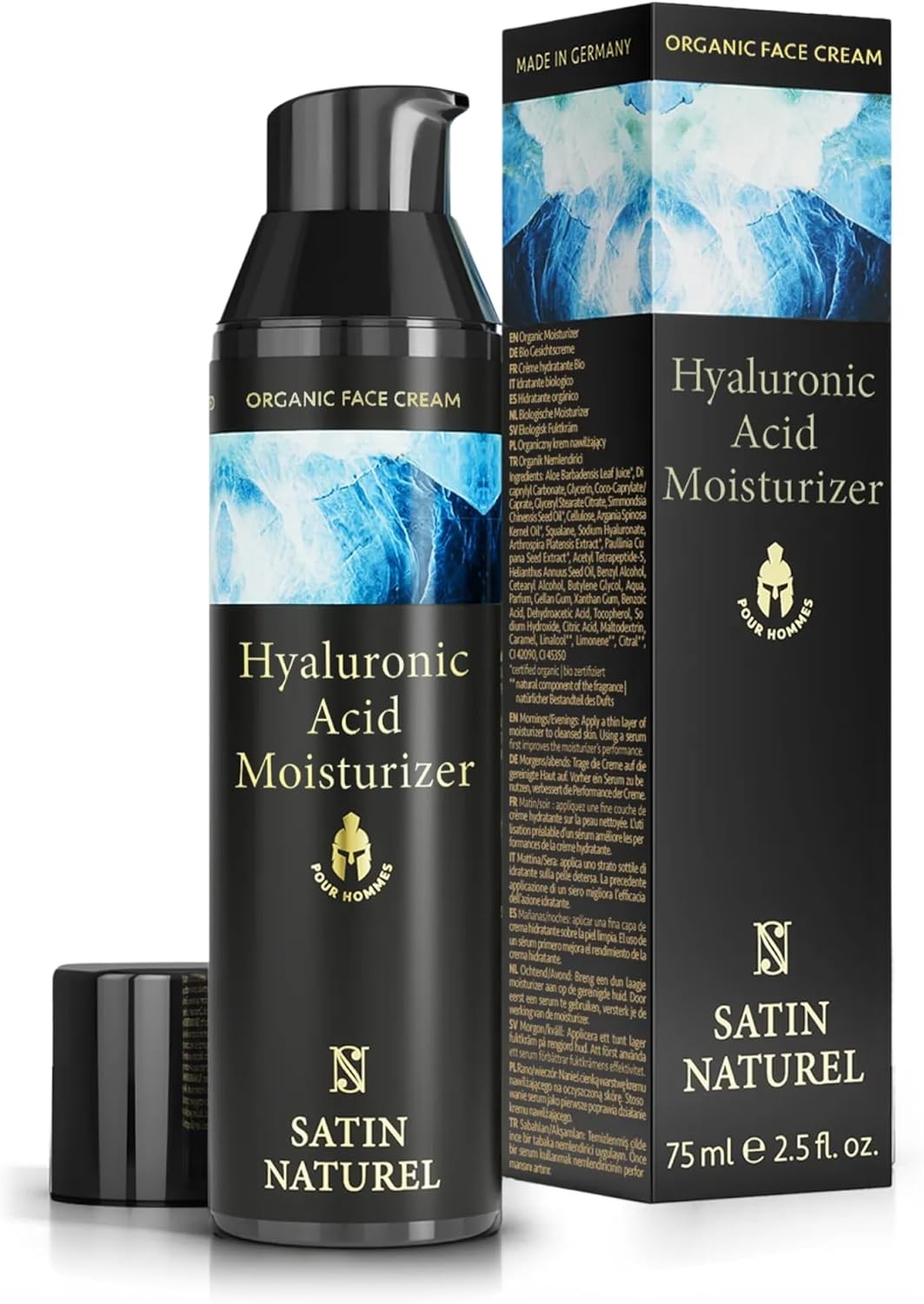 Satin Naturel Hyaluronic Acid Face Moisturiser for Men 75ml - Organic Mens Skincare & Anti Aging face Cream with Aloe Vera - Day & Night Cream - Mens