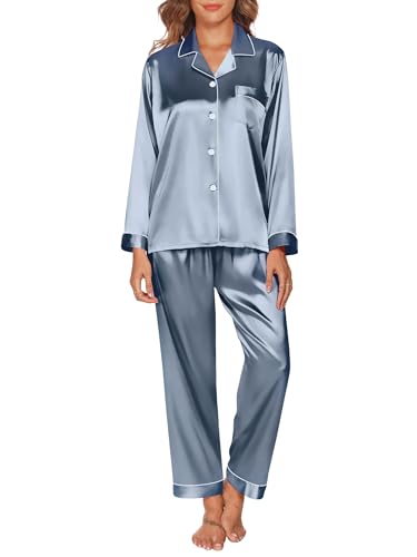 Ekouaer Ladies Pyjamas Satin Pjs for Women Sets Button Down Sleepwear Two Piece Comfy Loungewear,Blue L