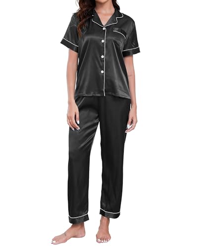 SWOMOG Silk Satin Pyjamas Black Pyjama Set for Women Short Sleeve Button Down Pj Set Comfy Pjs