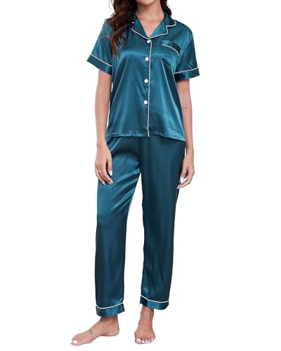TeJoyce Silk Pyjamas for Women Satin Pjs Set Women's Pyjama Set Short Sleeve and Pants 2 Piece Sleepwear Ladies Button Down Loungewear Dark Green