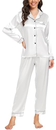 Vlazom Pyjamas for Women, Soft Satin Pjs Set Two Piece Silk Pyjamas for Ladies Button Down Sleepwear Loungewear White,L