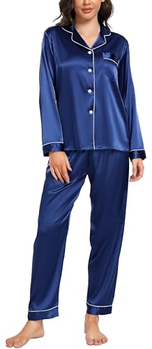 Vlazom Pyjamas for Women, Soft Satin Long Sleeve Pjs Set Two Piece Silk Pyjamas Classic Button Down Sleepwear Loungewear for All Seasons Navy Blue,M