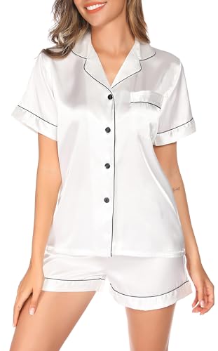 Lovasy Silk Pyjamas for Women Satin Pyjama Set Button Down Ladies Pajamas Classic Short Pjs Sets,White,M