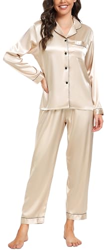 Vlazom Pyjamas for Women, Soft Satin Long Sleeve Pjs Set Two Piece Silk Pyjamas Classic Button Down Sleepwear Loungewear for All Seasons Champagne,S