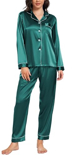 Vlazom Pyjamas for Women, Soft Satin Long Sleeve Pjs Set Two Piece Silk Pyjamas Classic Button Down Sleepwear Loungewear for All Seasons Dark Green,L
