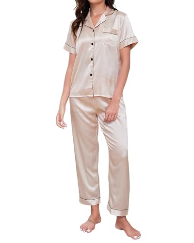 Lovasy Silk Pyjamas for Women Satin Pyjama Set Button Down Ladies Pajamas Classic Short Pjs Sets,Champagne,L