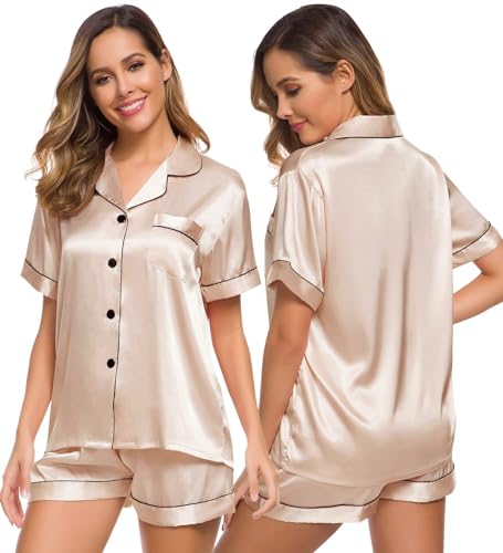 SWOMOG Satin Pyjamas Silk Pjs Lightweight Pyjamas for Women Short Bride Pyjama Set Notched Collar Champagne
