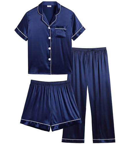 SWOMOG Kids Satin Pyjamas Sets Girls Boys Button-Down Pjs Short Sleeve Silk Nightwear 3 Pieces Lounge Sets Navy Blue