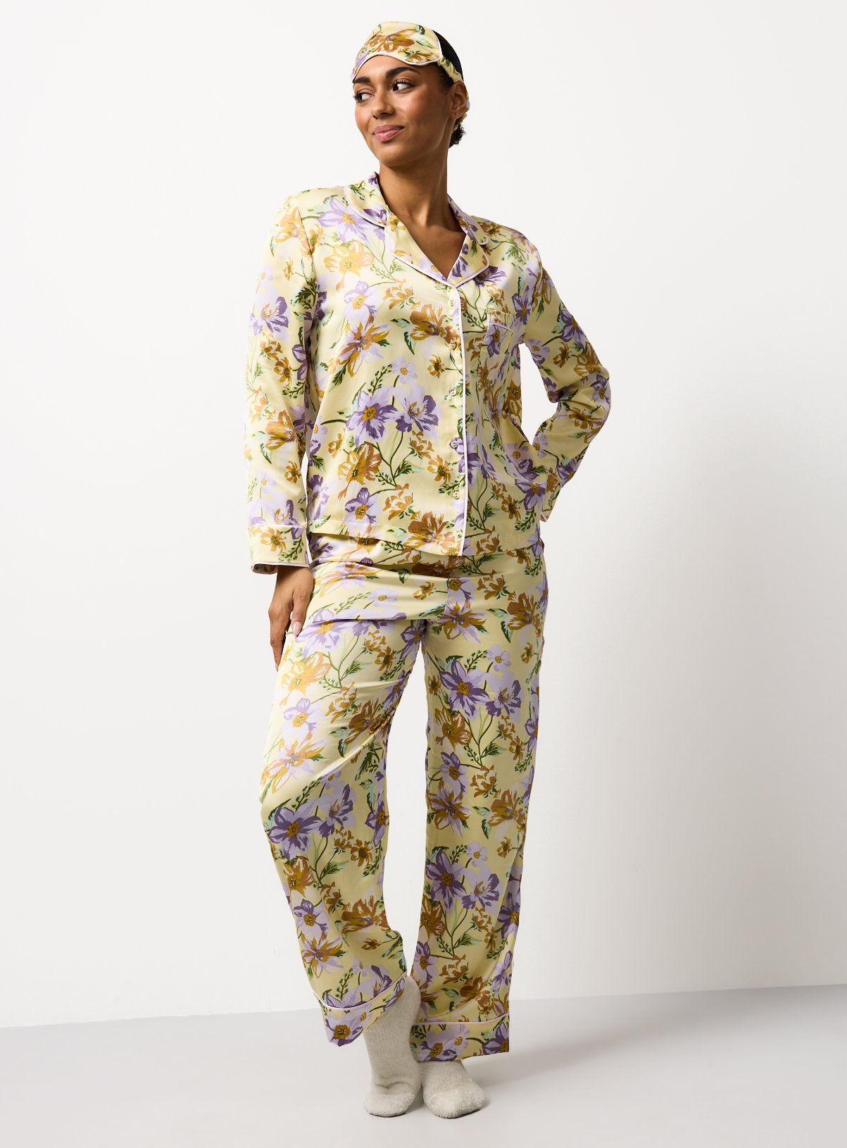 Yellow Large Floral Print Traditional Satin Pyjamas XL