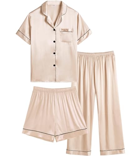 SWOMOG Kids Satin Pyjamas Sets Girls Boys Button-Down Pjs Short Sleeve Silk Nightwear 3 Pieces Lounge Sets Champagne