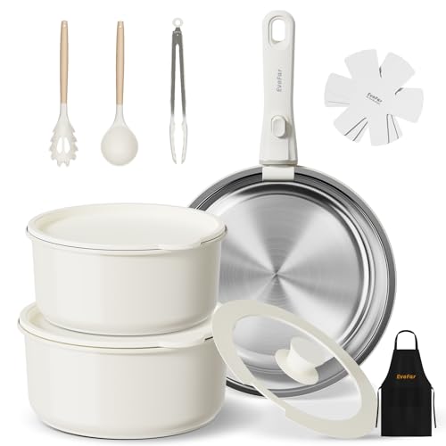 EVOFAR 14 Piece Stainless Steel Pots and Pans Set, Induction Hob Pan Set with 24cm Frying Pan, 18cm & 22cm Saucepans, Cookware Set with Detachable Handle, Lids and Apron, for All Hob Types