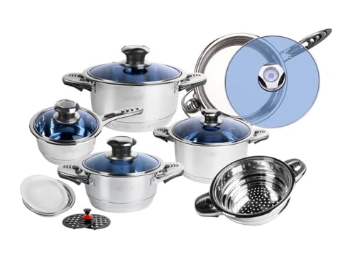 ROYALTY LINE, Set of 16 Pieces, Stainless Steel cookware, Frying pan, saucepans, with Glass lids + Accessories Included, All Heat Sources, Silver