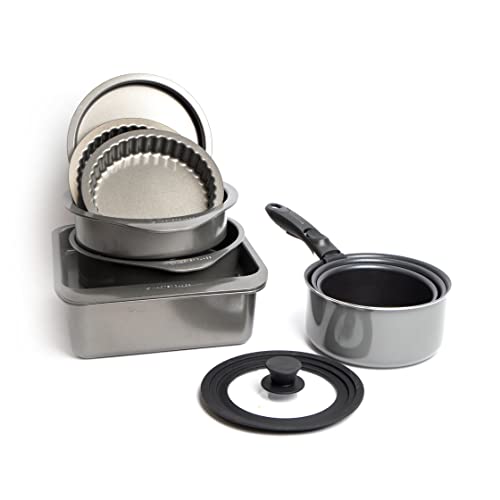 MasterClass Smart Space Saucepans, Non-Stick Saucepans for All Hobs, 5-Piece Set, Grey & Smart Space Stacking Non-Stick Bakeware Set, 7 Piece Baking Trays, Gift Boxed