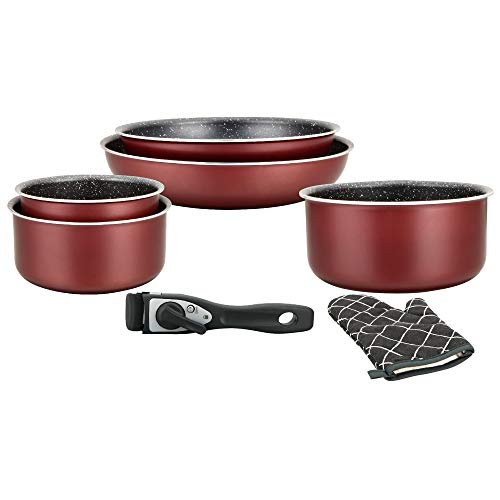 Herzberg HG8053 BR Cookware Set, Set of 3 Induction Saucepans and 2 Frying Pans for All Heat Sources of Different Sizes and 1 Oven Mitt, Non-Stick Marble Coating, Removable Handles, Red