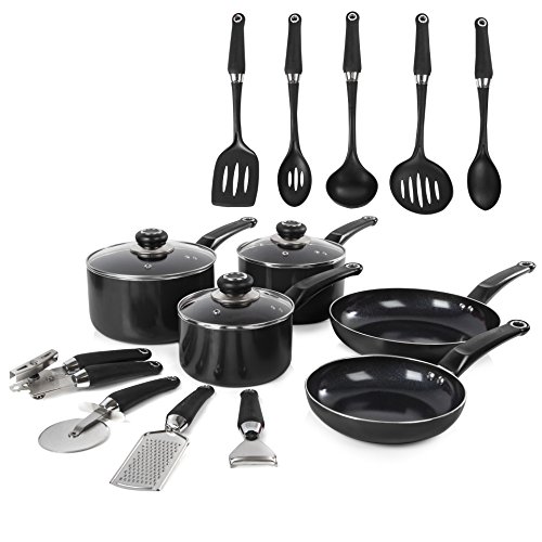 Morphy Richards Equip 20 Piece Cookware Set (4 Pots + 2 Saucepans + 14 Utensils), Black, Aluminium