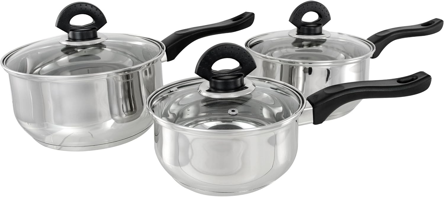 Buckingham Premium 3 Pieces Saucepans Set with Glass Lid Stainless Steel Bakelite Handles and Even Heat Distribution