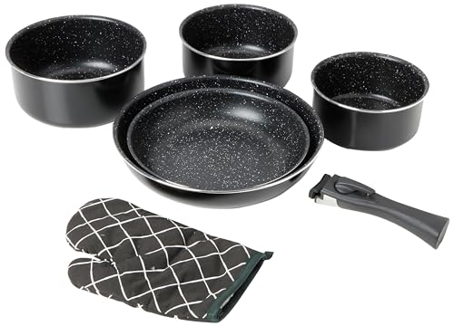 Herzberg HG8053 BLK Cookware Set, Set of 3 Induction Saucepans and 2 Frying Pans for All Heat Sources of Different Sizes and 1 Oven Mitt, Non-Stick Marble Coating, Removable Handles, Black