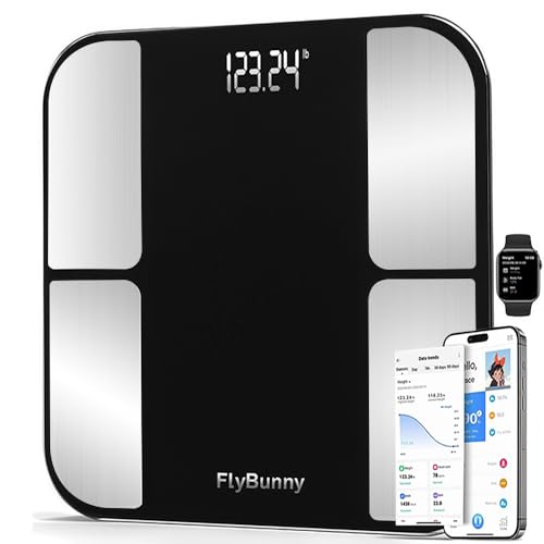 FlyBunny Scales for Body Weight, Weighing Scales, Bluetooth Body Fat Scales, Digital Bathroom Scale for Weight, BMI, Fat%– Body Composition Analyzer – Accurate Weighing Scale with APP -Silver & Black