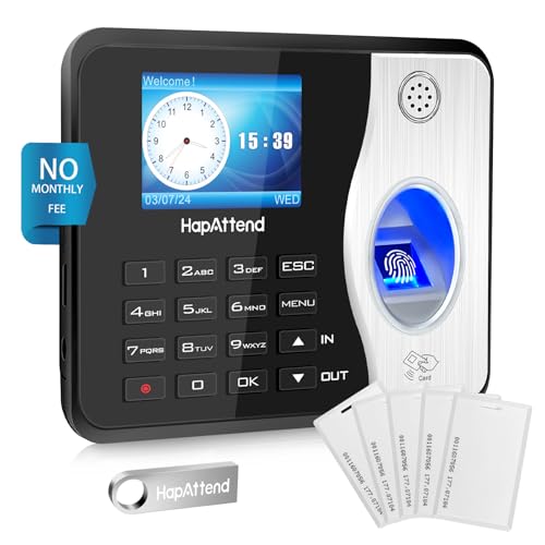 HapAttend Clocking in Machine - Standalone Card Scanner Attendance Machine with 5 RFID Cards, H3 Fingerprint Time Clocks for Employees Small Business Automatic Calculate Hours(0 Monthly Fees)