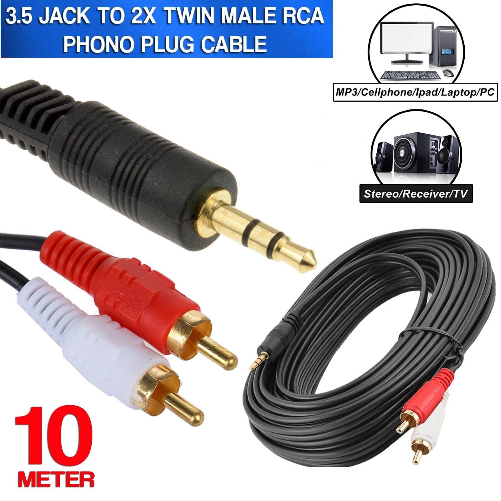 10Meter 3.5mm Stereo Audio Jack to 2 x Twin Male RCA Phono Plugs Cable Lead Gold