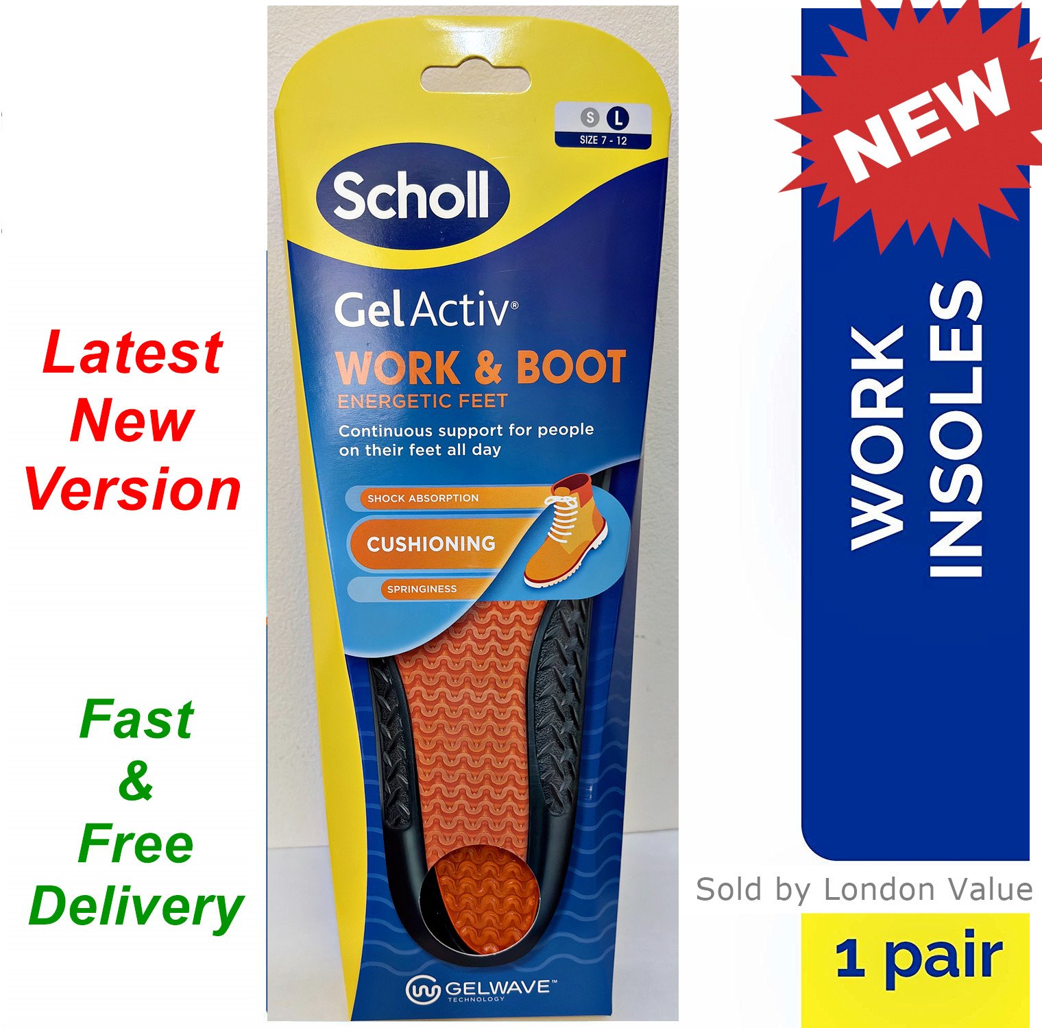 Scholl GelActiv Work & Boot Insoles Men Women, All Day Comfort at Work, UK 7-12