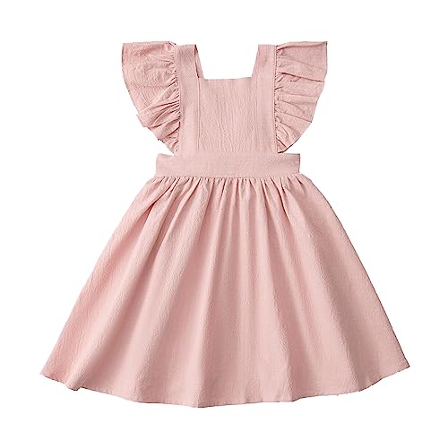Fccrian Kids Girls Dress Summer Solid Color Fly Sleeves Back Bow Dress Birthday School Plaid Girls (Pink, 3-4 Years)