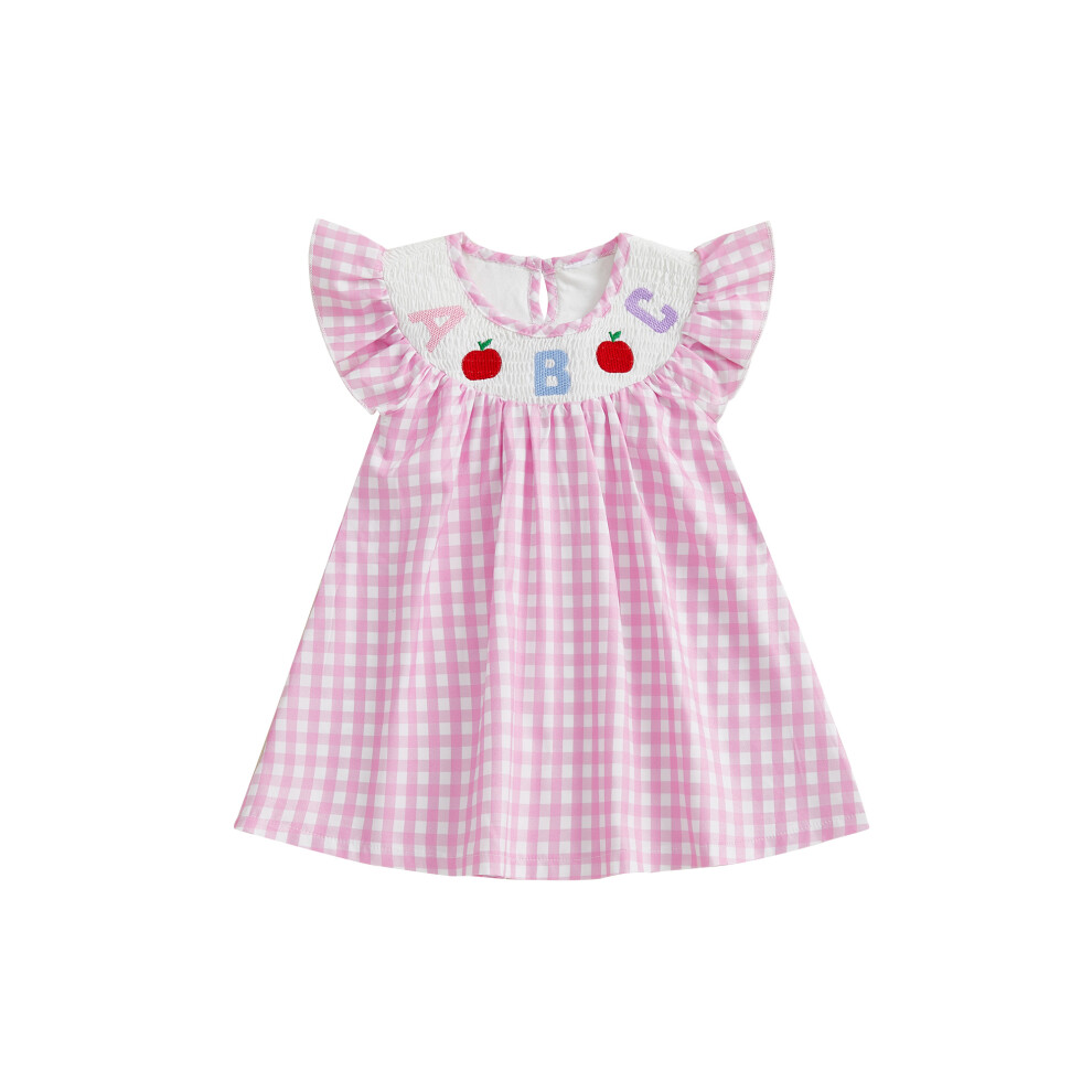 (4-5 Years, Pink) Toddler Girls Back to School Dress Summer Letter Apple Embroidery Plaid Print Fly Sleeve Dress for Cute Clothes