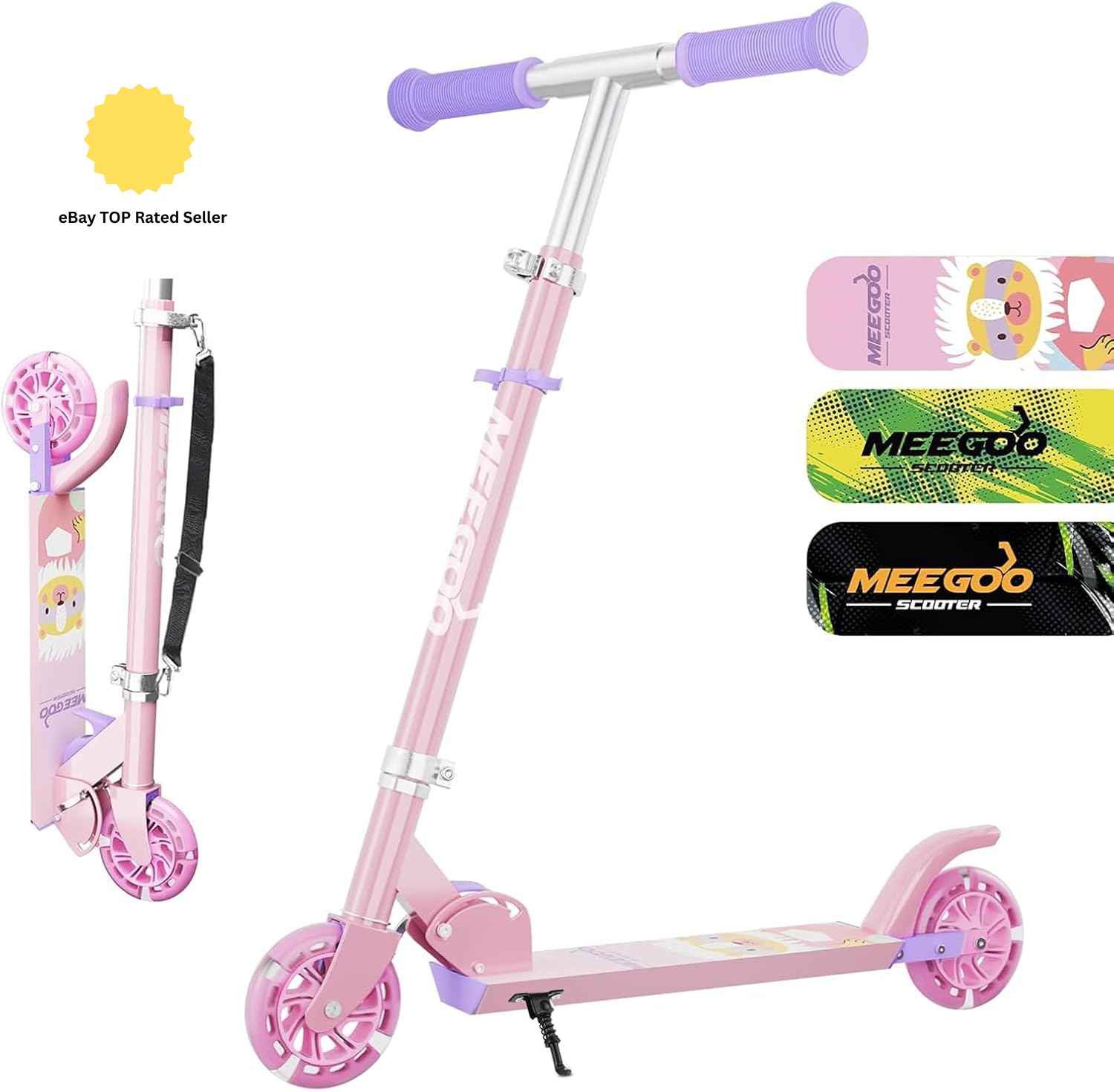 MEE GOO Scooter for Kids Ages3+, 2 Wheels Light Up Gift Scooters for Girls Boys, Easy Folding Kids Scooter with 3 Levels Adjustable Handlebar and Rear Brake (Pink)